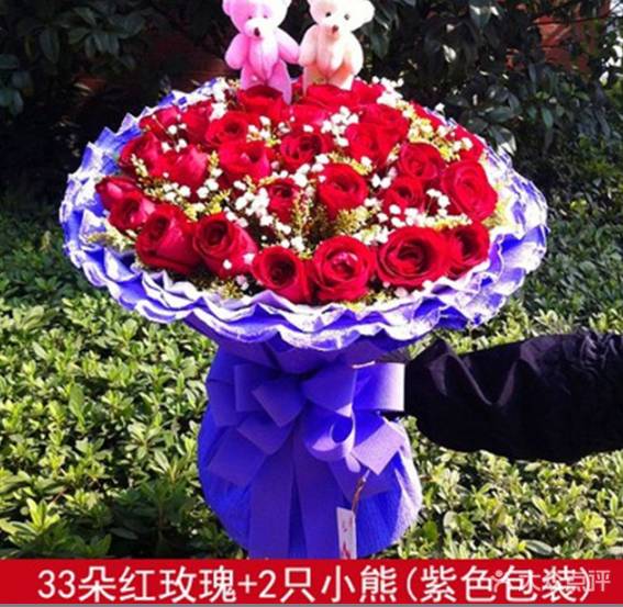 33朵红玫瑰花束加两只小熊 包装大气,按图做 |