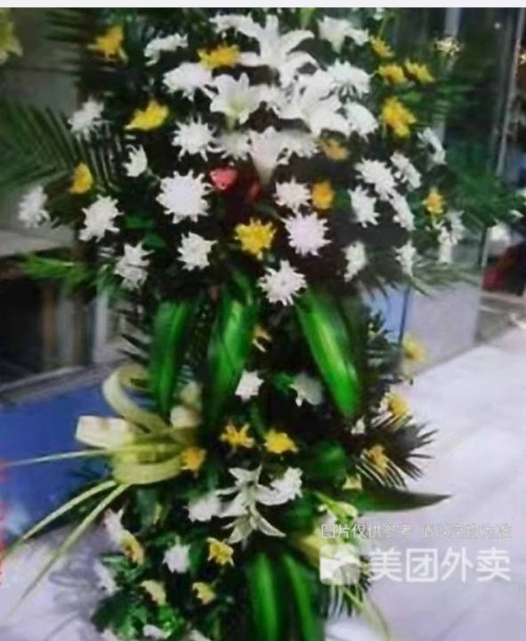 夜上海论坛双层白事花篮,黄色加白色菊花,白色百合,务必按照图片制作谢谢,做大气点 |