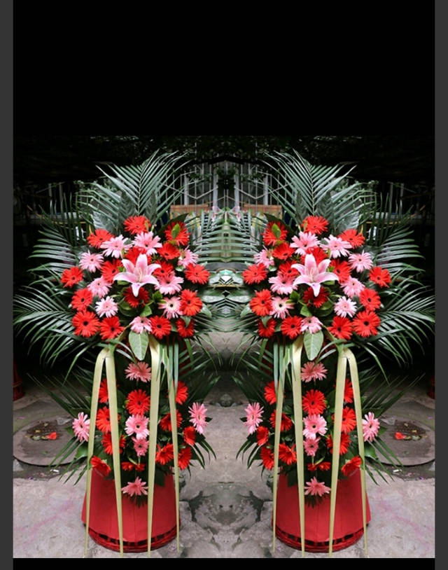 2个双层花篮,每个花材:60朵太阳花+8朵百合+3枝剑兰(或富贵竹)+5根剑叶+巴西叶+栀子叶+散尾叶,红色棉纸包住,搭配丰满,大气,如图制作,务必保证如图效果,以免客户投诉,否则投诉自理 |