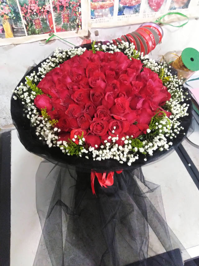 99支玫瑰外围黄英满天星,黑纱款包装。下午4点半左右送达,不要早了! |