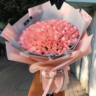 99朵粉玫瑰 里层灰色雾面纸 外层粉色包装纸韩束包装 粉灰色扎带 |