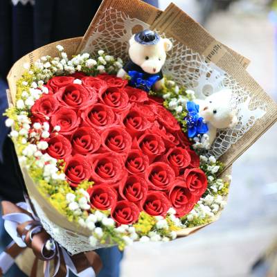 33朵红玫瑰花束+2小熊,搭配黄英,满天星,如图制作。包好看些。花一定要新鲜 |