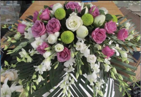 一个挂钩讲台花,,绿色乒乓菊+紫玫瑰+白玫瑰+白色洋兰+散尾叶搭配丰满,按图制作,务必保证新鲜和质量 |