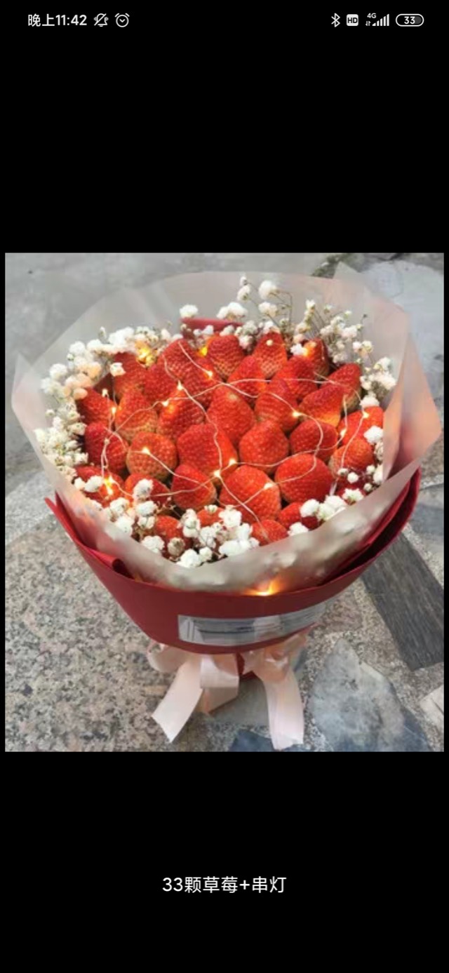 夜上海论坛33颗草莓白色满天星,LED灯,里层白色雾面纸,外层酒红包装纸,浅粉色丝带或者米色 |