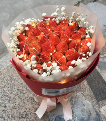 33颗草莓 白色满天星 雾面纸内衬 酒红色外包装 米色丝带 |
