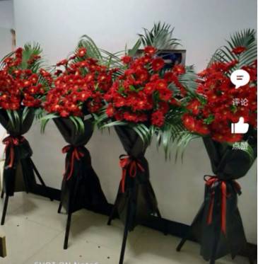 夜上海论坛2个高端三角架花篮:每个花材:50朵红玫瑰++尤加利+栀子叶+龟背叶,底下黑色卡纸包装,纸包大一些,看起来大气,花材饱满,底下系个红色大蝴蝶结 |