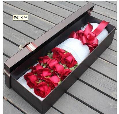 夜上海论坛9朵红玫瑰搭配黄英白色包装 深色礼盒