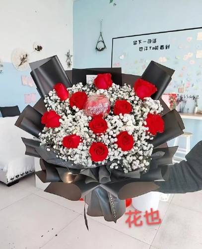 11支红玫瑰配满天星+一个红苹果花束,如图 |