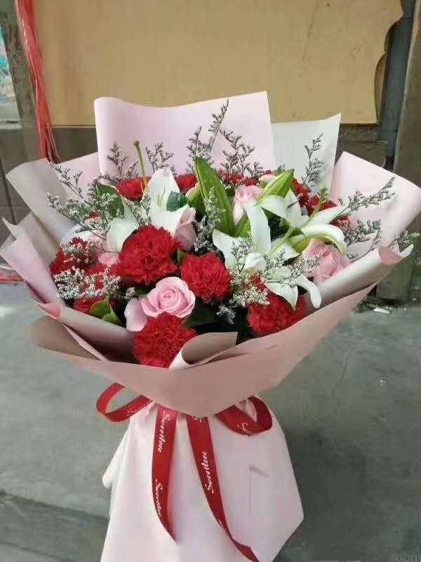 粉玫瑰红康乃馨百合混搭花束,如图 |