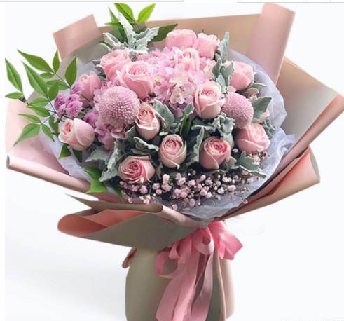 15朵粉玫瑰2朵粉色绣球2朵乒乓花球搭配满天星混搭花束 款式包装如图 |