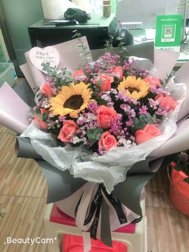 夜上海论坛11朵粉玫瑰2朵向日葵混搭满天星花束 如图 |