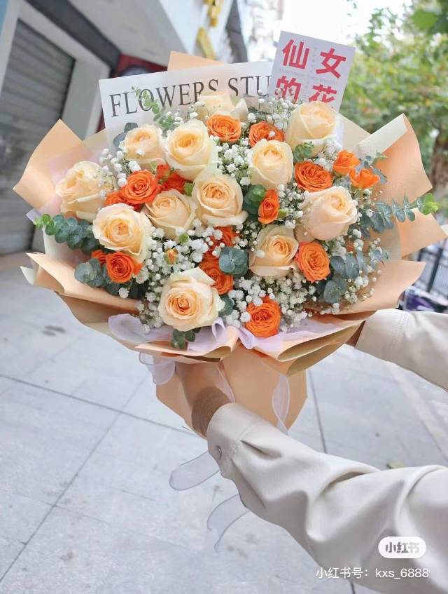 12支香槟玫瑰配橙芭芘满天星花束 数量:1 |