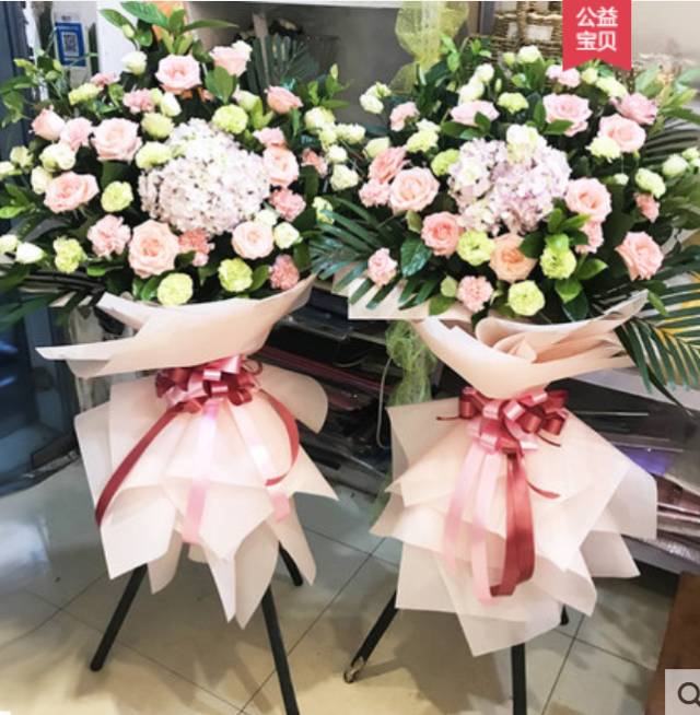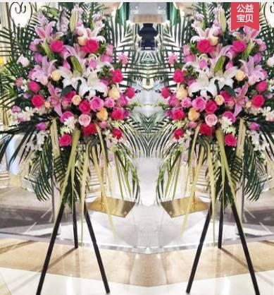 2个三脚架开业花篮:8朵白色香水百合+18朵戴安娜玫瑰+10朵香槟玫瑰+白色洋兰+粉色紫色桔梗搭配 散尾剑叶搭配丰满 按图制作13号上午9点半左右送达 2个花蓝条幅内容一样 |