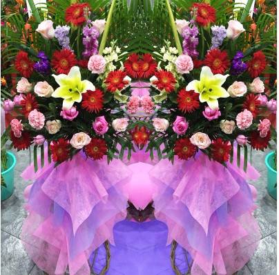 2个双层花篮:每个花材如下:45朵太阳花+6朵粉色,白色百合+栀子叶+巴西叶+剑兰或者富贵竹+散尾叶搭配丰满,如图红色绵纸包装制作,保证新鲜度,包大气一些 |