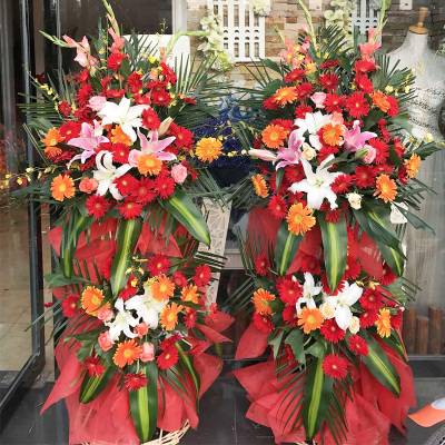 图1:2个单层开业花篮,每个花篮花材,(15朵红色扶郎花+9朵粉玫瑰+6朵粉色康乃馨+1朵百合+栀枝叶散尾叶搭配丰满+紫色粉色勿忘我+剑叶搭配)务必保证花材质量大气饱满,如图效果,如图制作。图2:2个双层开业花篮,每个花篮花材:40朵扶郎花+4朵粉色百合花+栀子叶(或是绿色配草)+散尾叶+红色绵纸搭配丰满+花篮,按图制作,务必保证花材质量和新鲜度,如图效果。图3:2个单层花篮,每个花篮花材:35朵 |