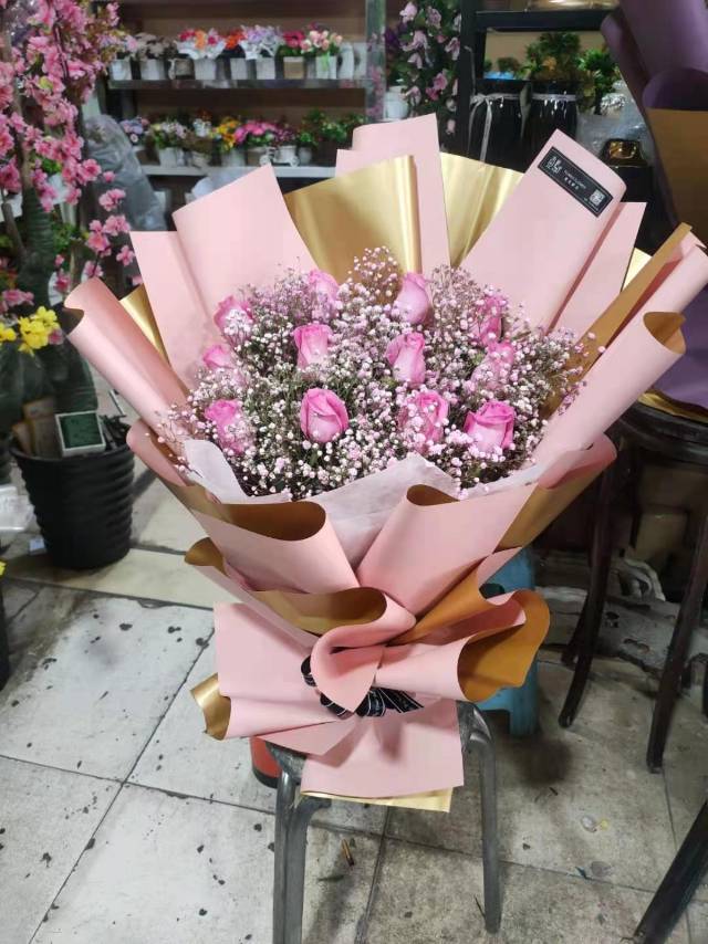 19支粉玫瑰混搭粉色满天星鲜花束。 |