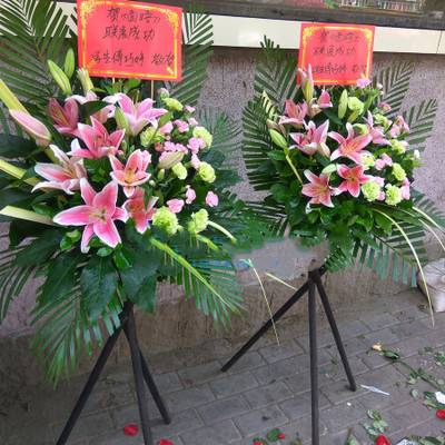 13朵粉百合 8朵绿康 粉多头康 散尾 剑叶 三脚架 散尾下面打低一点X2 |