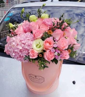 夜上海论坛19朵粉玫瑰 1粉绣球 粉绿桔梗 相思梅 尤加利 灯珠 粉色抱抱桶 波波球 |