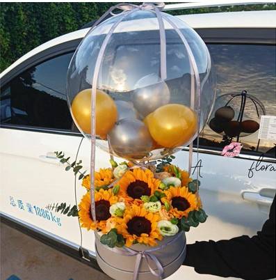 7朵向日葵5朵香槟玫瑰 桔梗 尤加利 白色波波球 里面灰色黄色小气球+一根发光灯 浅粉色抱抱桶 |