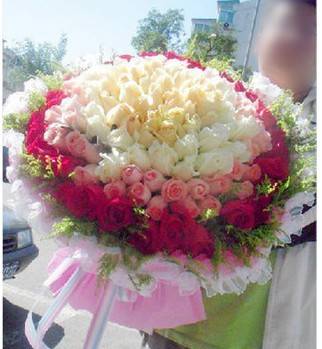 99朵红 粉 白 香槟玫瑰 灯珠 搭配黄英 白色粉色圆形包装 |