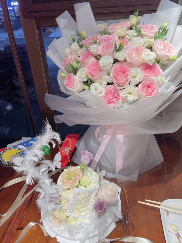 夜上海论坛19支洛神玫瑰配白色洋桔梗花束(包装纸粉白搭配) |