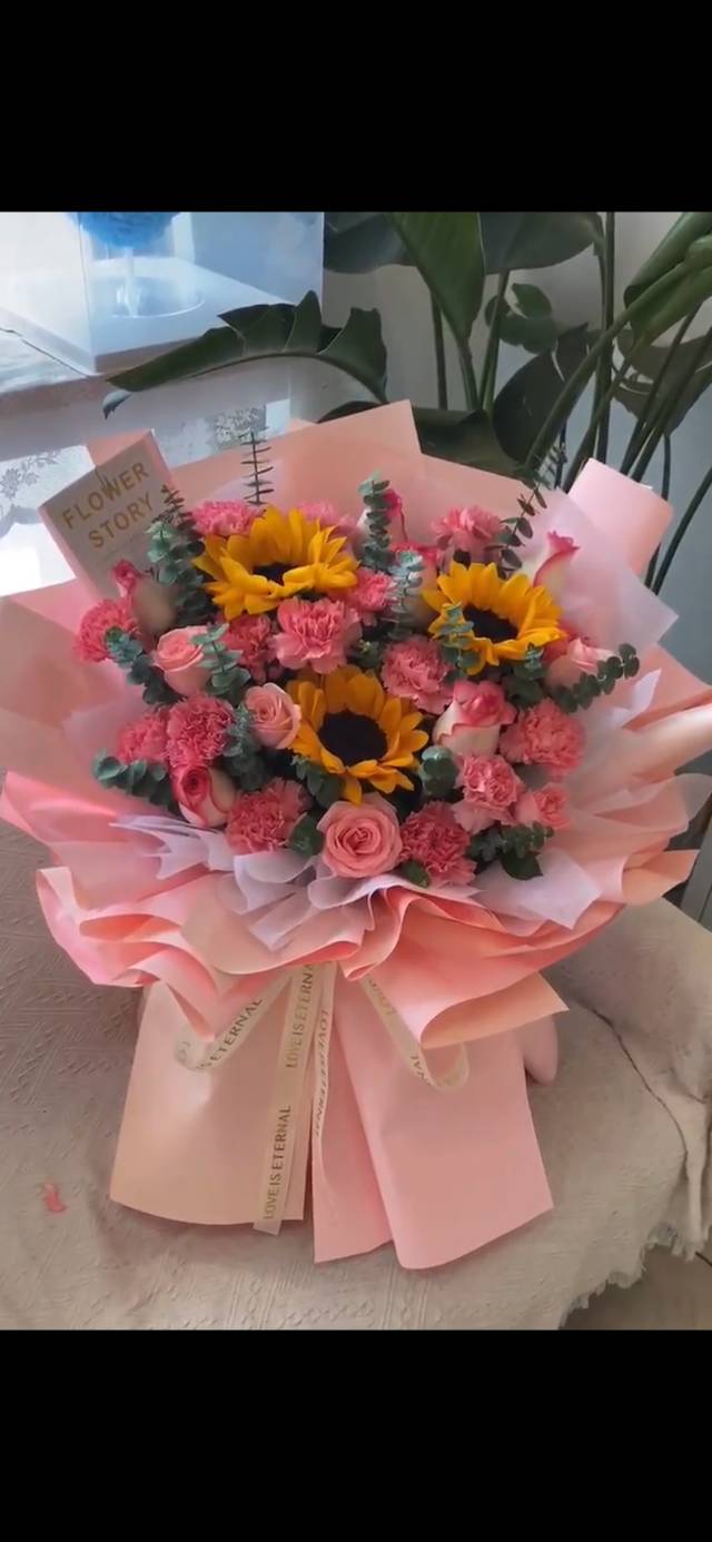 33支粉玫瑰 粉康乃馨混搭+3支向日葵花束,如图包 |