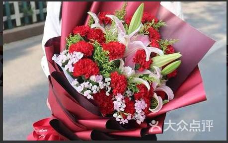 19朵红康乃馨加2支多头百合加满天星配花束,如图 |