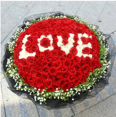 199朵 红 白 玫瑰混搭 LOVE 黄英白色满天星 黑色网纱 圆形包装 |
