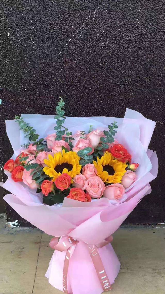 夜上海论坛15支粉玫瑰2支向日葵花束,如图制作 |