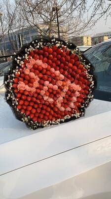 夜上海论坛166颗草莓 33朵粉玫瑰,拼字520 白色满天星,灯珠2根 黑色网纱包装拖地1.5米 |