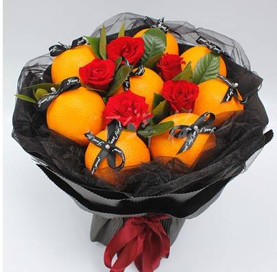 8个橙子5朵红玫瑰 栀子叶 黑色蝴蝶结 黑色包装纸 黑网纱 +灯珠