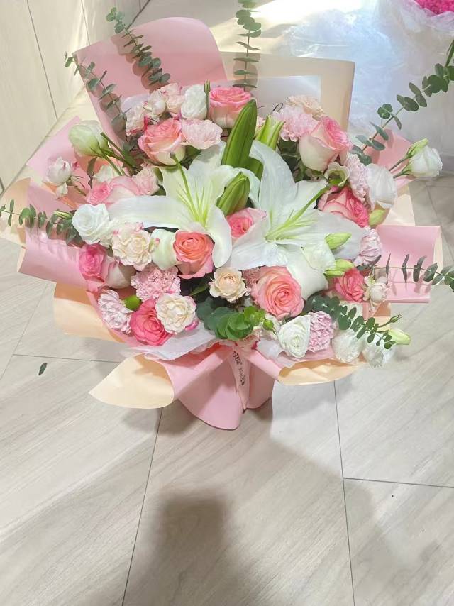 粉玫11朵。粉康11朵,还有百合。花束。如图包