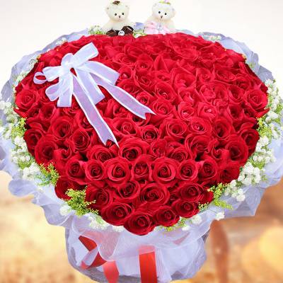 99红玫瑰 黄英满天星 白色网纱❤型包装 白色蝴蝶结 2个小熊