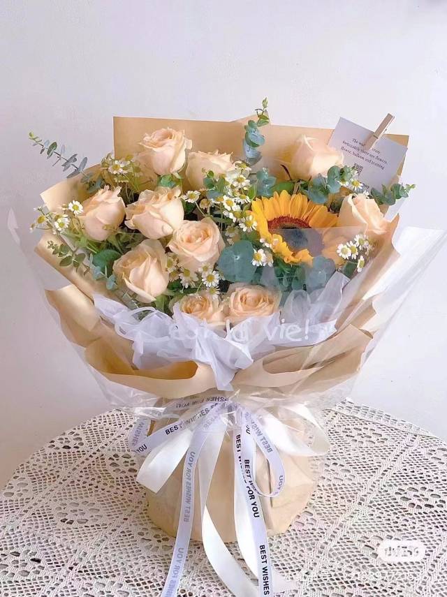 3支向日葵5支香槟玫瑰配橙泡泡洋桔梗混搭花束,如图 |