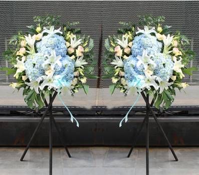 夜上海论坛3个蓝绣球 白百合 香槟桔梗 龟背叶 尤加利 花材丰满 三脚架 蓝色丝带