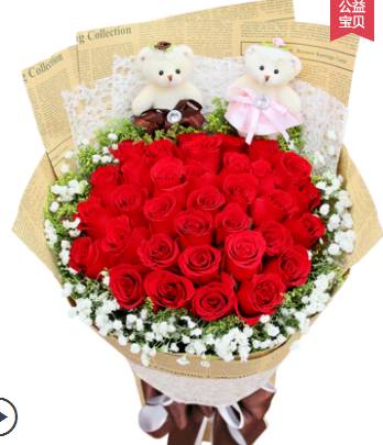 33朵红玫瑰2只小熊花束 款式包装如图 |