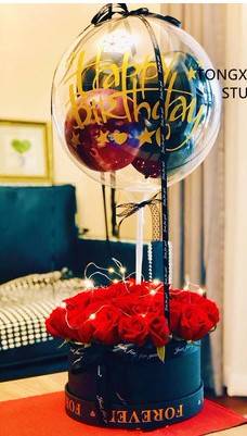 花材1:36朵红玫瑰 灯 黑色抱抱桶 波波球 小气球 (如图做) 花材2:6向日葵 5香槟 尤加利 雏菊 黑色抱抱桶 波波球 小气球 花材3:7粉玫 白乒乓 苏醒 银叶菊 刺芹 粉橘梗 粉色抱抱桶 波波球 小气球 (如图制作) |