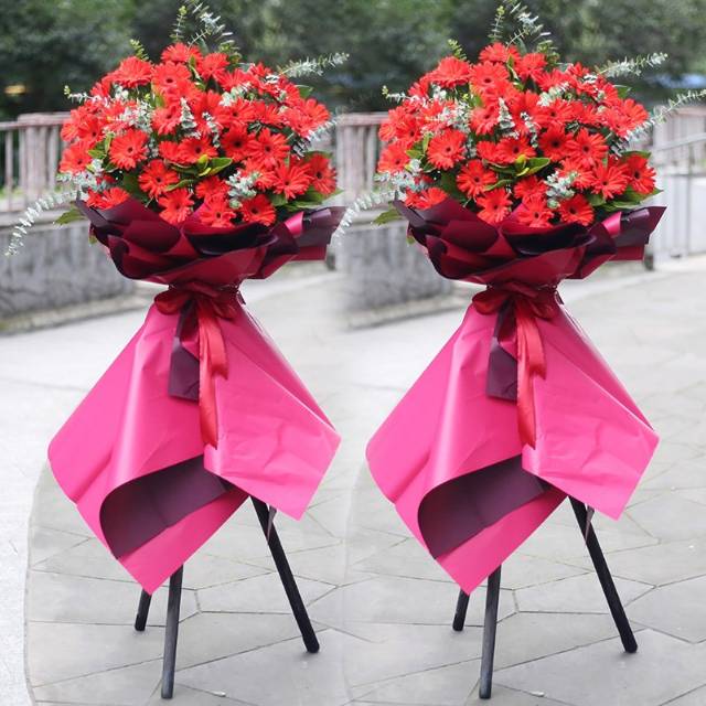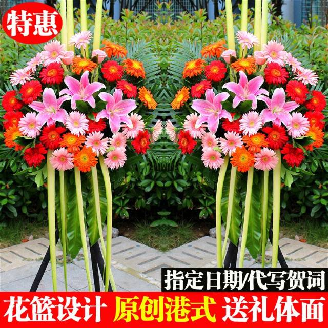 一共八个花篮: 图一:2个单层开业花篮,每个花篮花材(30朵太阳花+3朵百合+栀子叶+剑叶+散尾叶搭配丰满,如图底部用红色棉纸包装,如图制作,花材饱满,新鲜,大气 图二:2个三角架花篮,每个花材:40朵扶郎花 4朵百合花 散尾叶搭配丰满 三角架,如图制作包装,保证新鲜度,需要看起来大气 图三:4个双层开业花篮,每个花篮花材:45朵扶郎花+4朵粉色百合花+散尾叶+红色绵纸搭配丰满+花篮,按图制 |