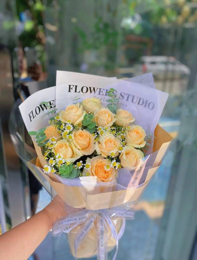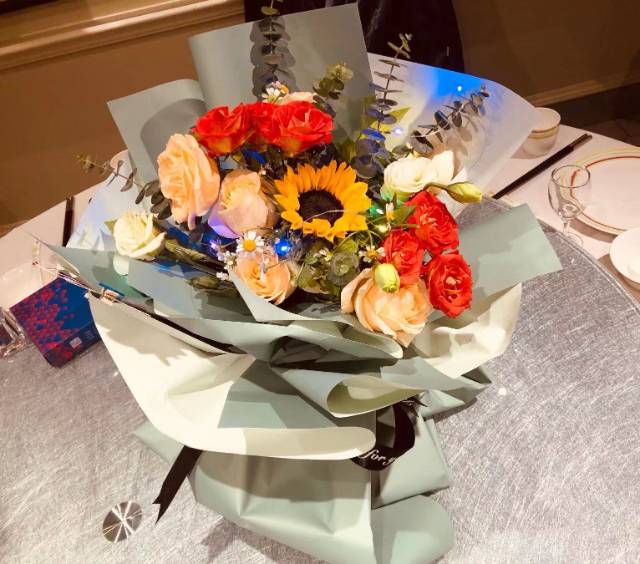 夜上海论坛9朵香槟玫加2朵向日鲜花束,送军人的,包装纸用图的 |
