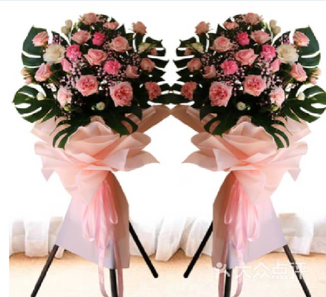 23朵粉玫+满天星混搭开业花篮一对,如图包装,按时送达,有贺词(等确认好再发给你)