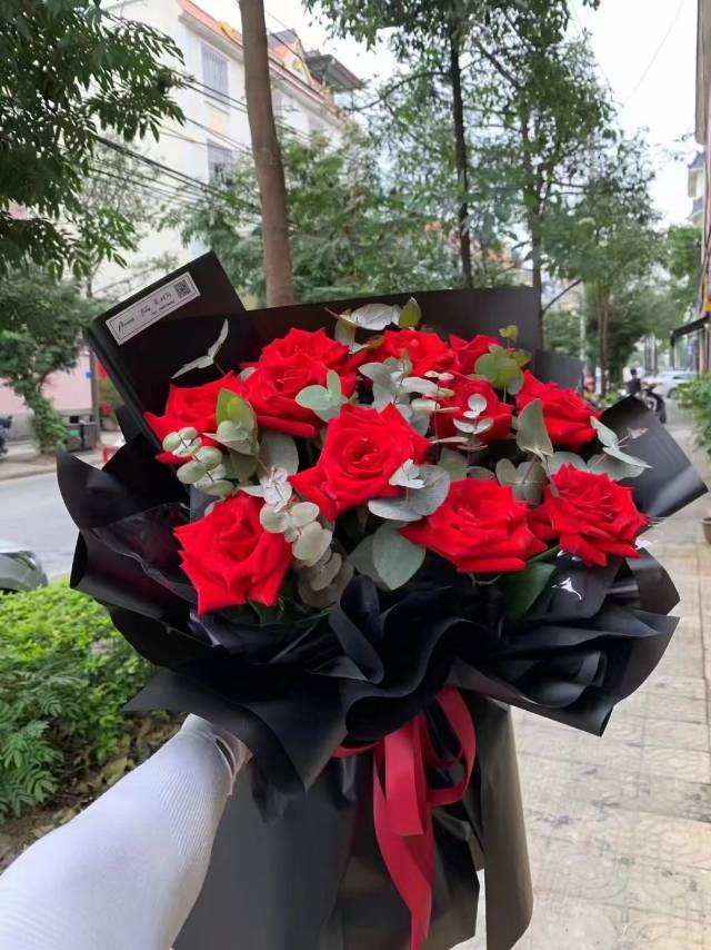 33支精品红玫瑰花束,款式如图,用黑纱包 |
