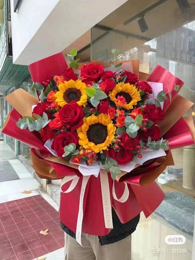 11支红康乃馨8支红玫瑰3支向日葵混搭花束,如图 |
