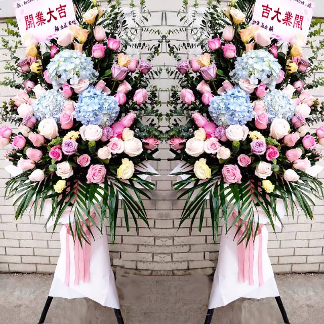 2个高档三角架花篮:每个花材如下:3个蓝绣球+50朵玫瑰(粉玫瑰+香槟+白玫瑰+紫玫瑰)+尤加利+散尾叶,底下粉色纸包住,如图制作。一定要大气。饱满 |