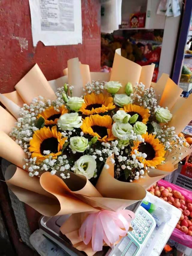 6朵向日葵7支洋桔梗满天星鲜花束,如图包 |