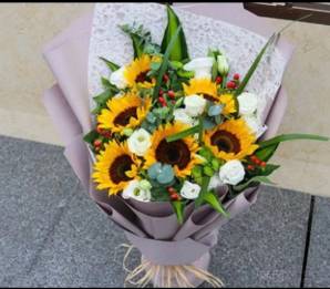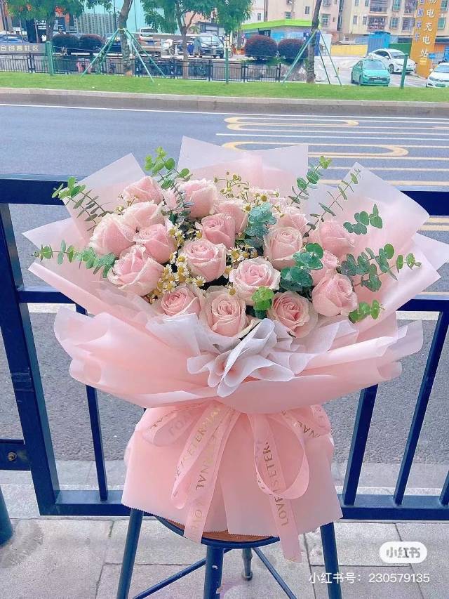 夜上海论坛6朵粉玫瑰混搭粉蓝星鲜花束,如图包 |