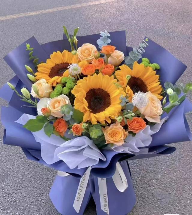 3支向日葵6朵香槟玫瑰配橙泡泡小菊花束,如图 |