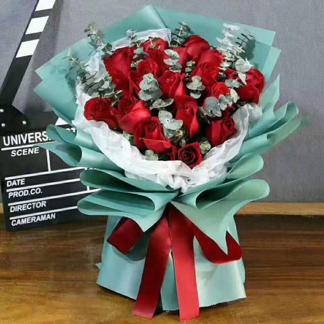19朵红玫瑰配尤伽俐花束,黑色包装 如图