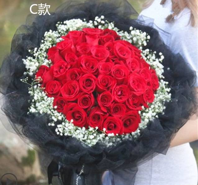 33朵红玫瑰黑纱包装周边配白色满天星,如图包 |