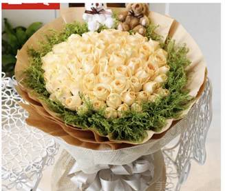 33朵香槟玫瑰加2小熊花束,如图包。请一定要准时送到。收花人在开会, |