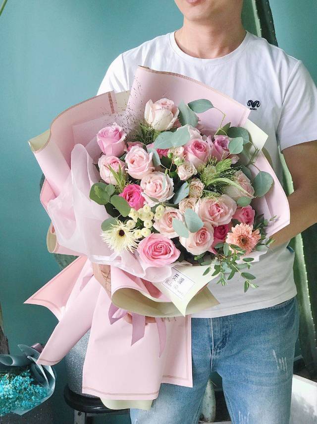 19朵粉玫瑰花束,如图包装,有卡片,按时送达 |